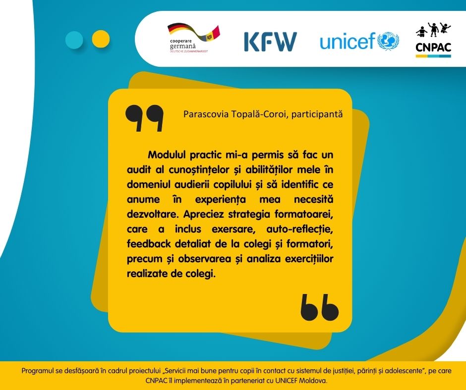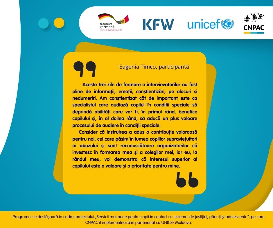 Vezi și: S-a desfășurat cea de-a doua etapă a programului de formare a intervievatorilor în domeniul audierii copilului victimă/martor a infracțiunilor