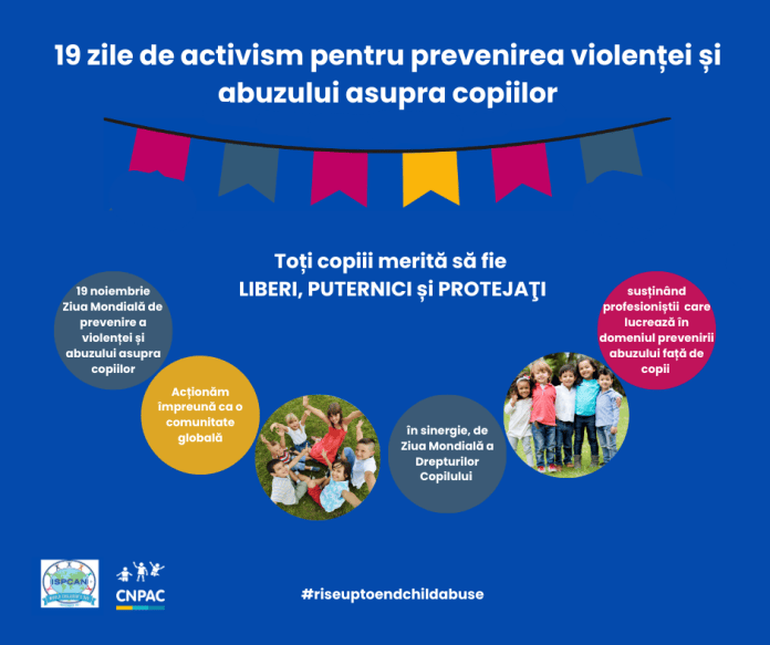 Centrul Naţional de Prevenire a Abuzului faţă de Copii (CNPAC/NCCAP) lansează, astăzi, Campania „19 zile de activism și prevenire a violenței și abuzului împotriva copiilor și tinerilor” cu genericul ,,𝐀𝐝𝐨𝐥𝐞s𝐜𝐞𝐧ț𝐢𝐢 î𝐦𝐩𝐨𝐭𝐫𝐢𝐯𝐚 𝐯𝐢𝐨𝐥𝐞𝐧ț𝐞𝐢”.
