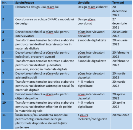 Activitatea presupune selectarea unei companiei IT care va transforma suporturile teoretice de curs elaborate pentru instruirea intervievatorilor, asistenților sociali, ofițerilor de poliție, judecătorilor, procurorilor și avocaților, în resurse educaționale stocate pe medii electronice (eCurs -uri / e-learning).