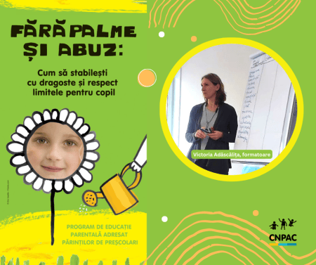 “Ne dorim să disiminăm cât mai activ modalitățile de educație sănătoasă prin intermediul programului de parenting “Fără palme” și să facem părinții să înțeleagă ce simte propriul copil, care sunt cauzele comportamentului nedorit al copiilor și cum pot schimba acest comportament fără să apeleze la modalități abusive de educație. Susținem participarea activă a părinților în programele de parenting inițiate de CNPAC și îi încurajăm să se înscrie la instruirile din cadrul programului “Fără palme”, apelând la cel mai apropiat centru de plasament din regiunea în care se află”, a menționat formatoarea cursului, Victoria Adăscăliță.