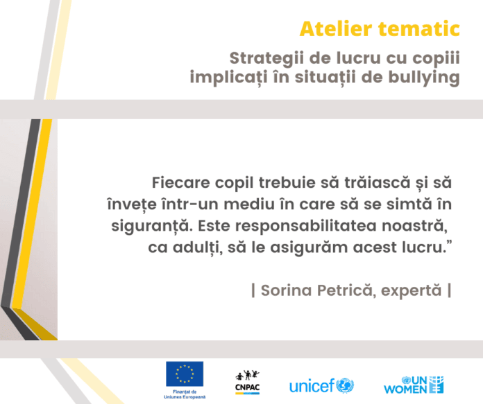 Atelierul online „Strategii de lucru cu copiii implicați în situații de bullying” este realizat de către CNPAC în cadrul Proiectului EVA „Promovarea egalității de gen în raioanele Cahul și Ungheni”, finanțat de Uniunea Europeană și implementat de UN Women în parteneriat cu UNICEF. Părerile și opiniile exprimate aici aparţin autorilor și nu reflectă neapărat punctul de vedere al UN Women, al UNICEF sau al Uniunii Europene.