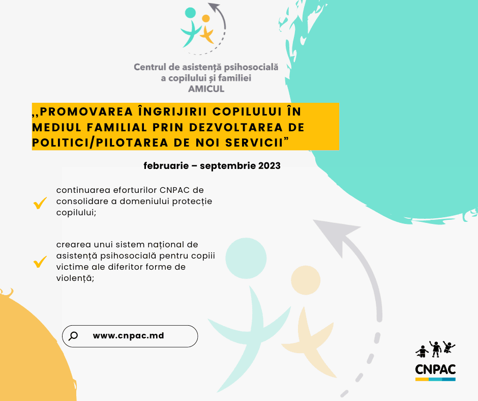 În perioada februarie – septembrie 2023, Centrul Național de Prevenire a Abuzului față de Copii (CNPAC) va implementa proiectul „Promovarea îngrijirii copilului în mediul familial prin dezvoltarea de politici/pilotarea de noi servicii” cu suportul Catholic Relief Services, Changing the way we care.
