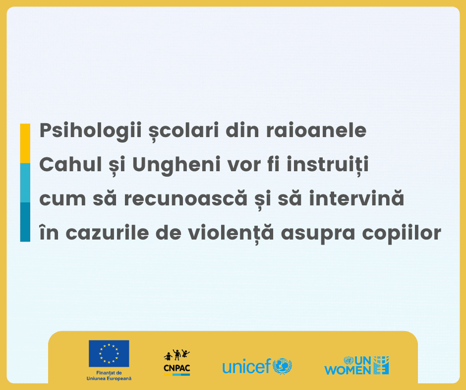 20 de psihologi școlari și din cadrul Serviciului de Asistență Psihopedagogică, din raioanele Cahul și Ungheni, își vor fortifica capacitățile pentru a preveni, identifica și oferi asistență copiilor afectați de violență. Aceștia vor participa la Programul de instruire „Răspunsul serviciului psihologic la cazurile de violență asupra copiilor, organizat de CNPAC în cadrul Proiectului EVA.
