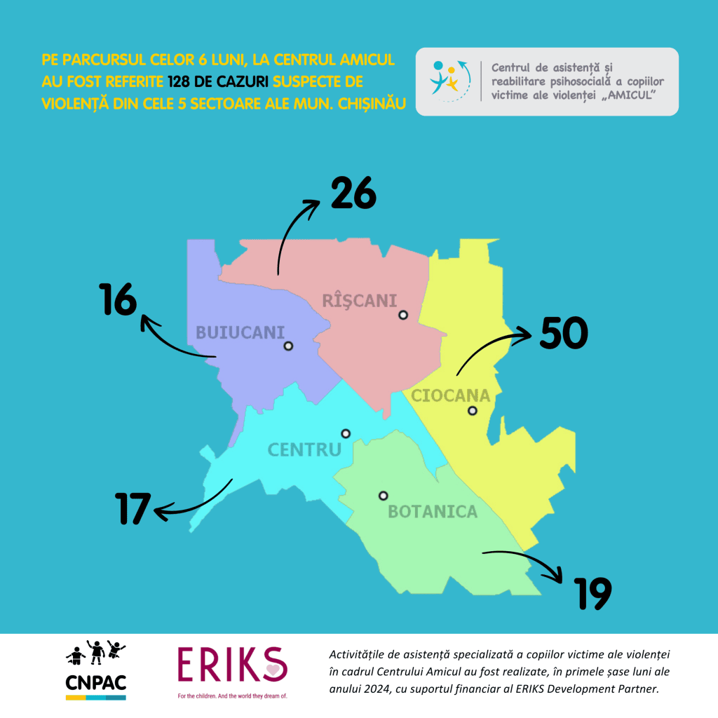 În perioada raportată, către Centrul Amicul au fost raportate 128 de cazuri suspecte de violență din cele cinci sectoare ale Chișinăului: Botanica (19), Buiucani (16), Centru (17), Ciocana (50), Râșcani (26), inclusiv din suburbii (16). Autoritățile tutelare au referit 48 de cazuri (37%), rudele copiilor au raportat 19%, Centrul de Justiție Familială al Poliției a raportat 37% din cazuri, iar alte surse, inclusiv victimele, au raportat 8 cazuri.