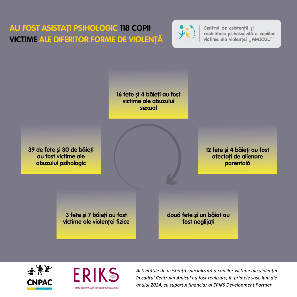 Pe parcursul acestor 6 luni, 118 copii victime ale diferitor forme de violență au fost asistați de specialiștii Centrului: