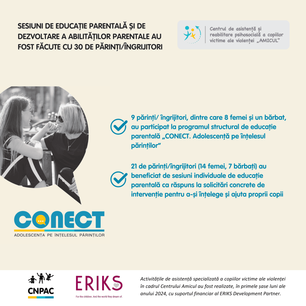 În perioada de raportare, 30 de părinți și îngrijitori au primit sesiuni pentru dezvoltarea abilităților parentale necesare pentru a răspunde nevoilor copiilor traumatizați. Programul „CONECT. Adolescență pe înțelesul părinților” a fost desfășurat, implicând 9 participanți în sesiuni structurale și alți 21 în sesiuni individuale, pentru a ajuta părinții să înțeleagă și să sprijine mai bine copiii lor.